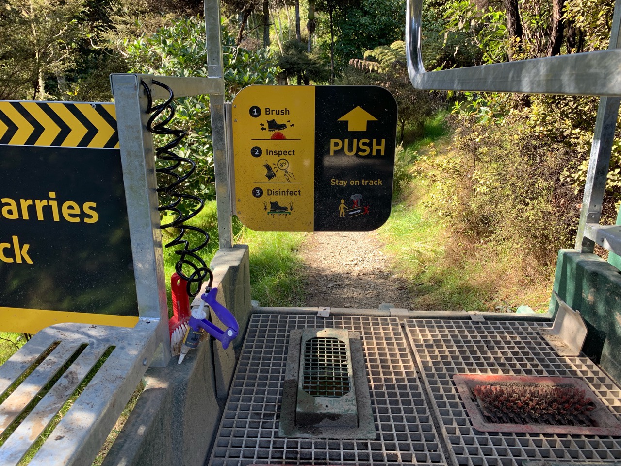 かつても靴底を消毒する場所はあったけど、きっと何もせずに森の中へ入るハイカーが多かったんでしょうね。何としても消毒させるぞ!というニュージーランド環境保全省の意気込みが伝わってきます(笑)。