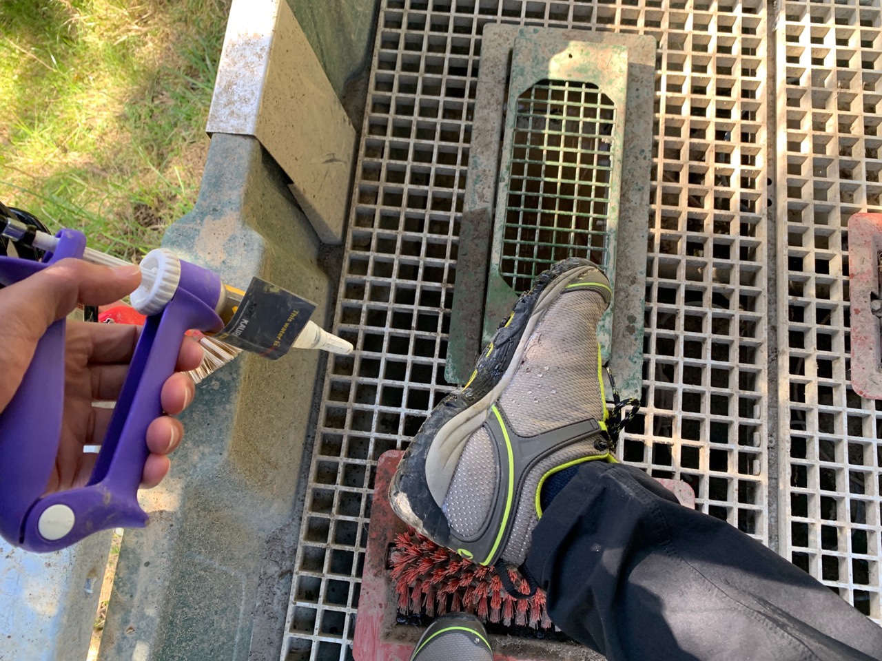 ①Brush(赤いブラシで靴底の汚れを落とす)
