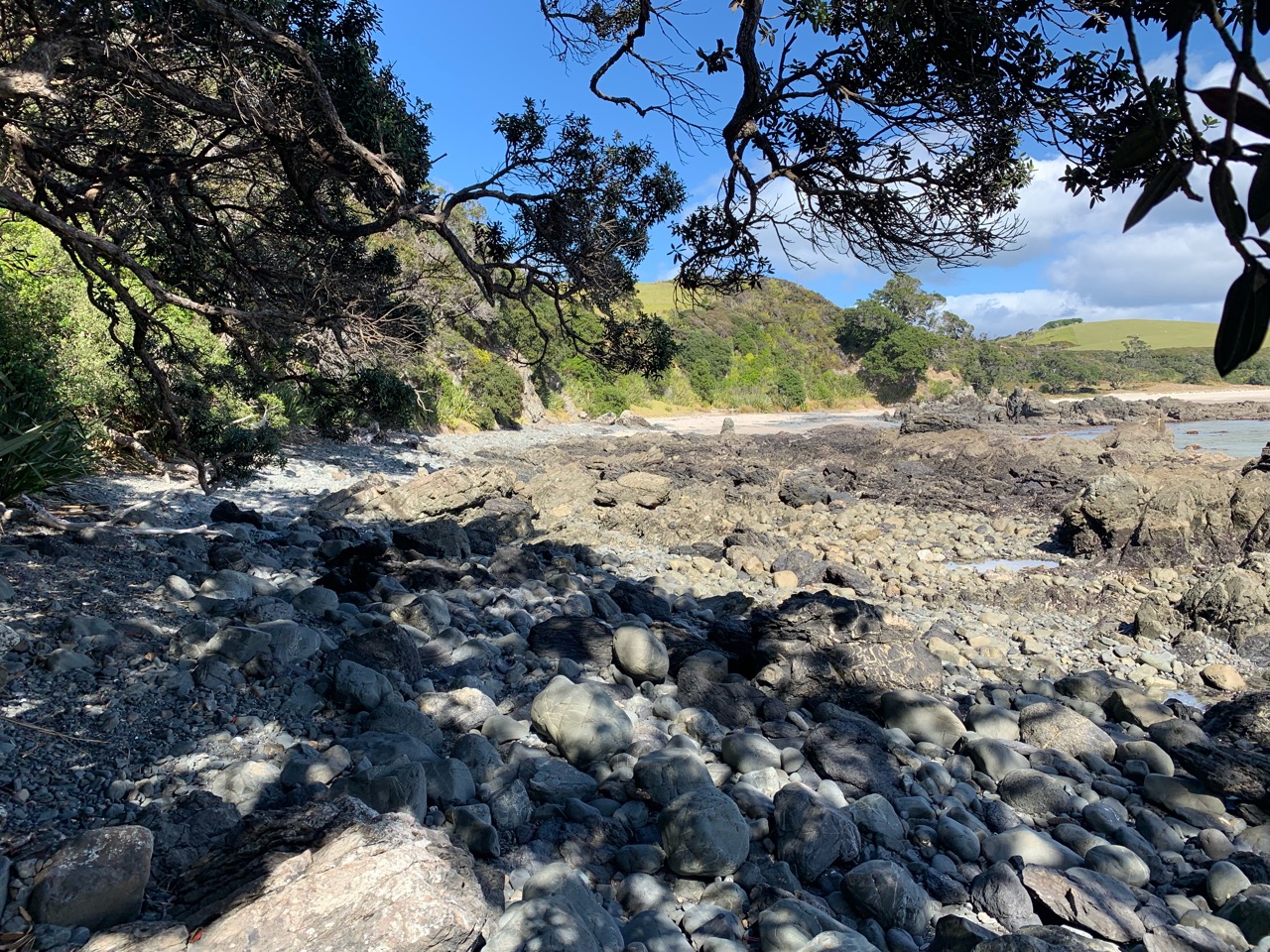 ごつごつして歩きにくいのですが、左側が砂浜になっているので、そちらを歩くようにします。