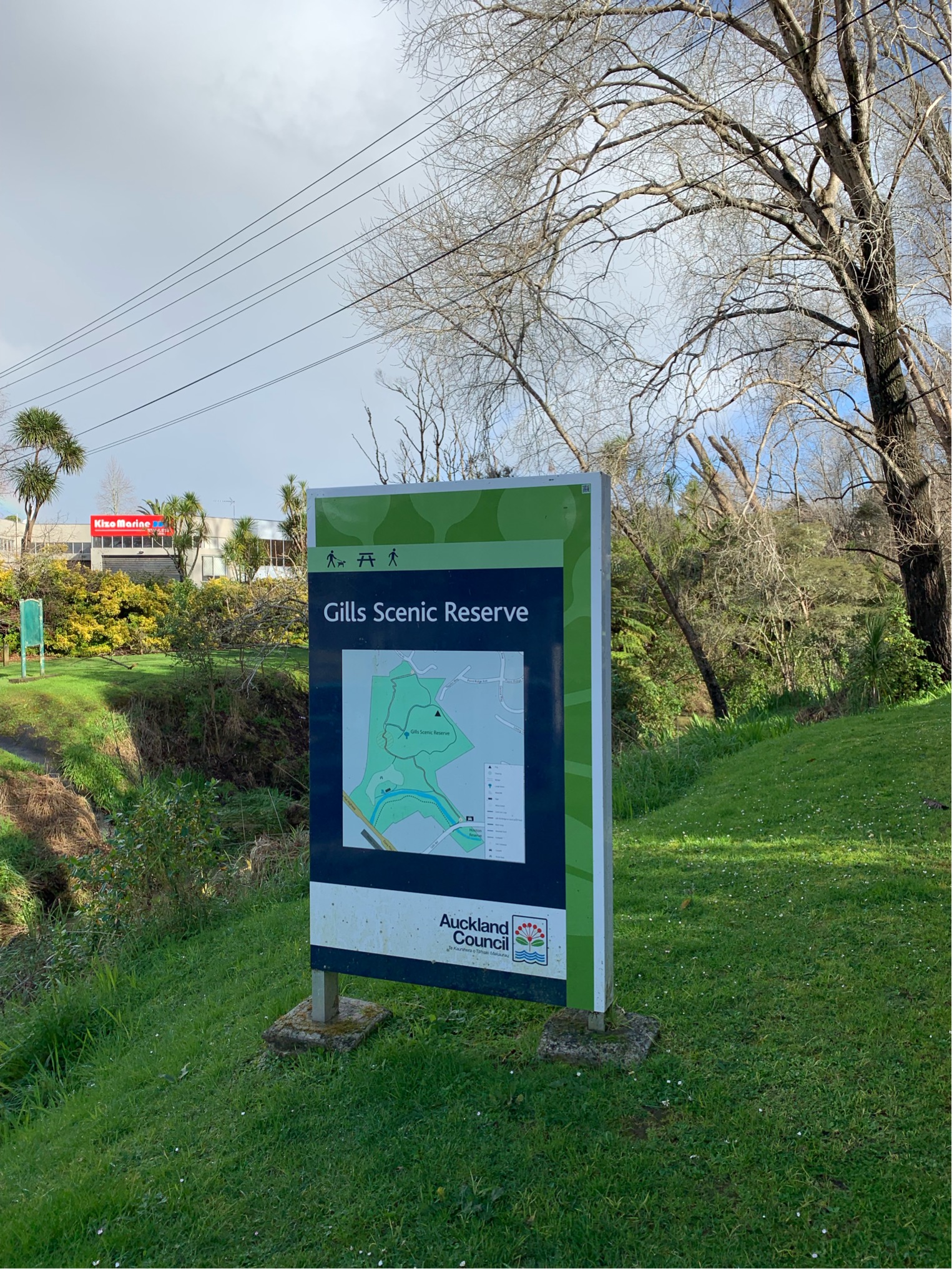 具体的には、オークランドの中心から北へ約25km、車で30分ほどのAlbany(アルバニー)という町にある、Gills Scenic Reserveというエリアです。この中に、全長約1.5km程のトレッキングコースがあります。