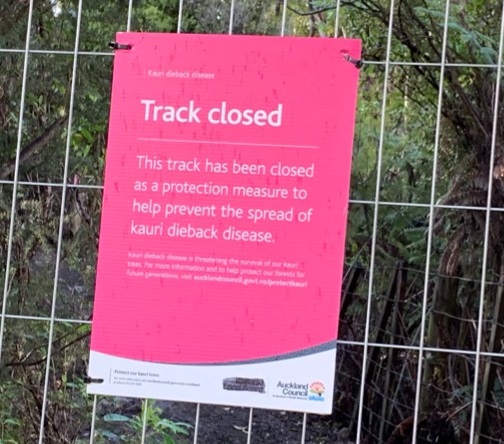 「カウリダイバックの拡散を防ぐための保護対策として、このトラック(トレッキングコース)は閉鎖されています」と書かれているではありませんか。。
