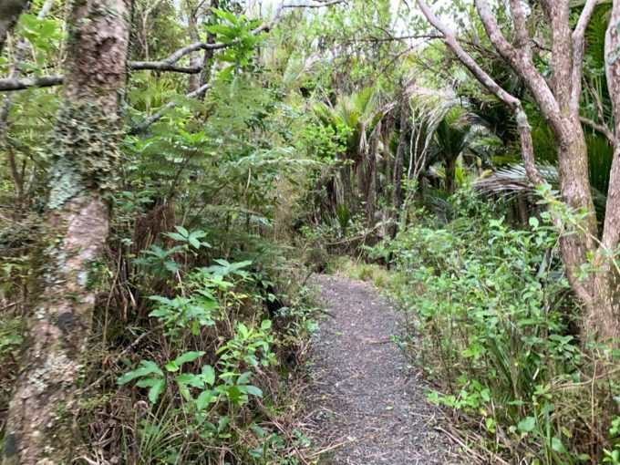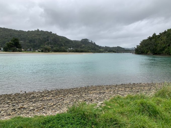 振り返ると、今歩いてきた丘が一望できます。この場所は、ココル・ベイという名前のようですね。ココル(Kokoru)とは、マオリ語で「湾」という意味らしいです。という事は、日本語で「湾・湾」?